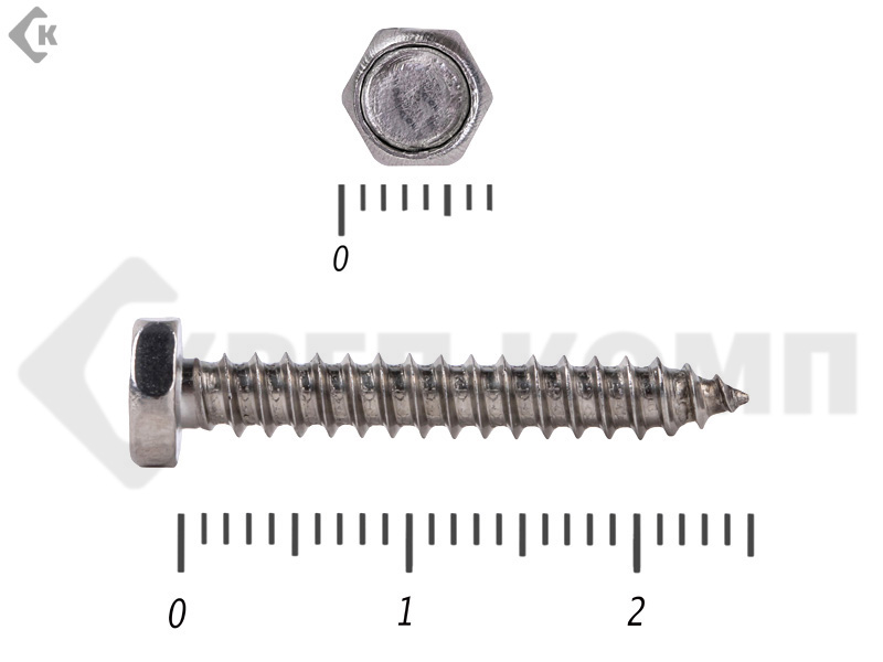 У самореза данного вида шестигранная головка, без шлица, под рожковый ключ, на стержне полная резьба и острый конец,