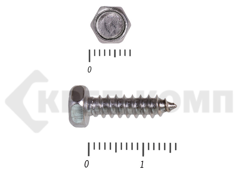 У самореза данного вида шестигранная головка, без шлица, под рожковый ключ, на стержне полная резьба и острый конец,