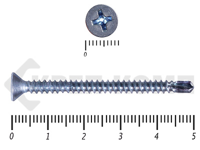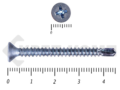 Оцинкованные потайные саморезы со сверлом DIN 7504 P – имеют полную резьбу и сверло на кончике. Потайная головка при вкручивании входит в материал и не выступает на поверхности. Такими саморезами можно закрепить листовые отделочные материалы из пластика, металла, фанеры к металлическим конструкциям. Саморез может высверливать отверстие в углеродистой стали толщиной до 4мм.