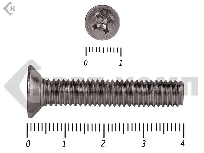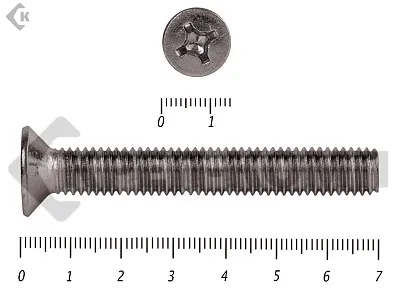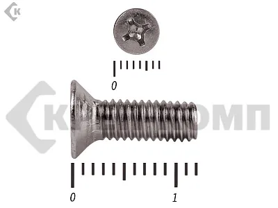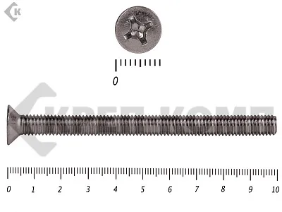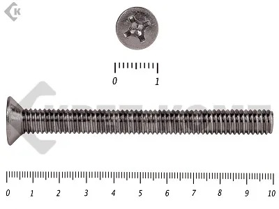 Винт DIN 965 из нержавейки с потайной головкой с крестообразным шлицем и полной резьбой. Данные винты выполнены из нержавеющей стали, благодаря чему, могут использоваться и в агрессивных средах, с повышенной влажностью. Винты нержавеющие DIN 965 используются в строительстве, машиностроении, промышленных и производственных отраслях совместно с шайбами, гайками соответствующих размеров.